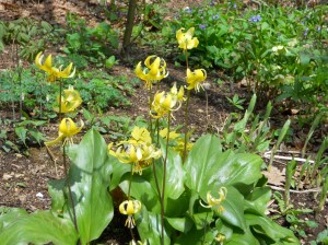Our next garden visit was to Bruce Lockhart’s woodland garden and new, still under-construction gardens. Here were large old clumps of Erythronium ‘Pagoda’ with their large yellow bells, and a huge patch of Podophyllum peltatum, the native Mayapple. There were massive stands of Epimedium and Primula vulgaris. You will be happy to know I did get a few photos of Bruce’s gardens…whew!!